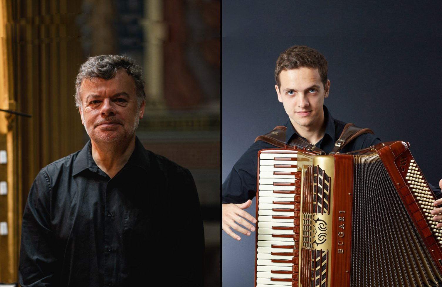 What kind of concert will the former organist of Westminster Cathedral and a Hungarian harmonica player give together?