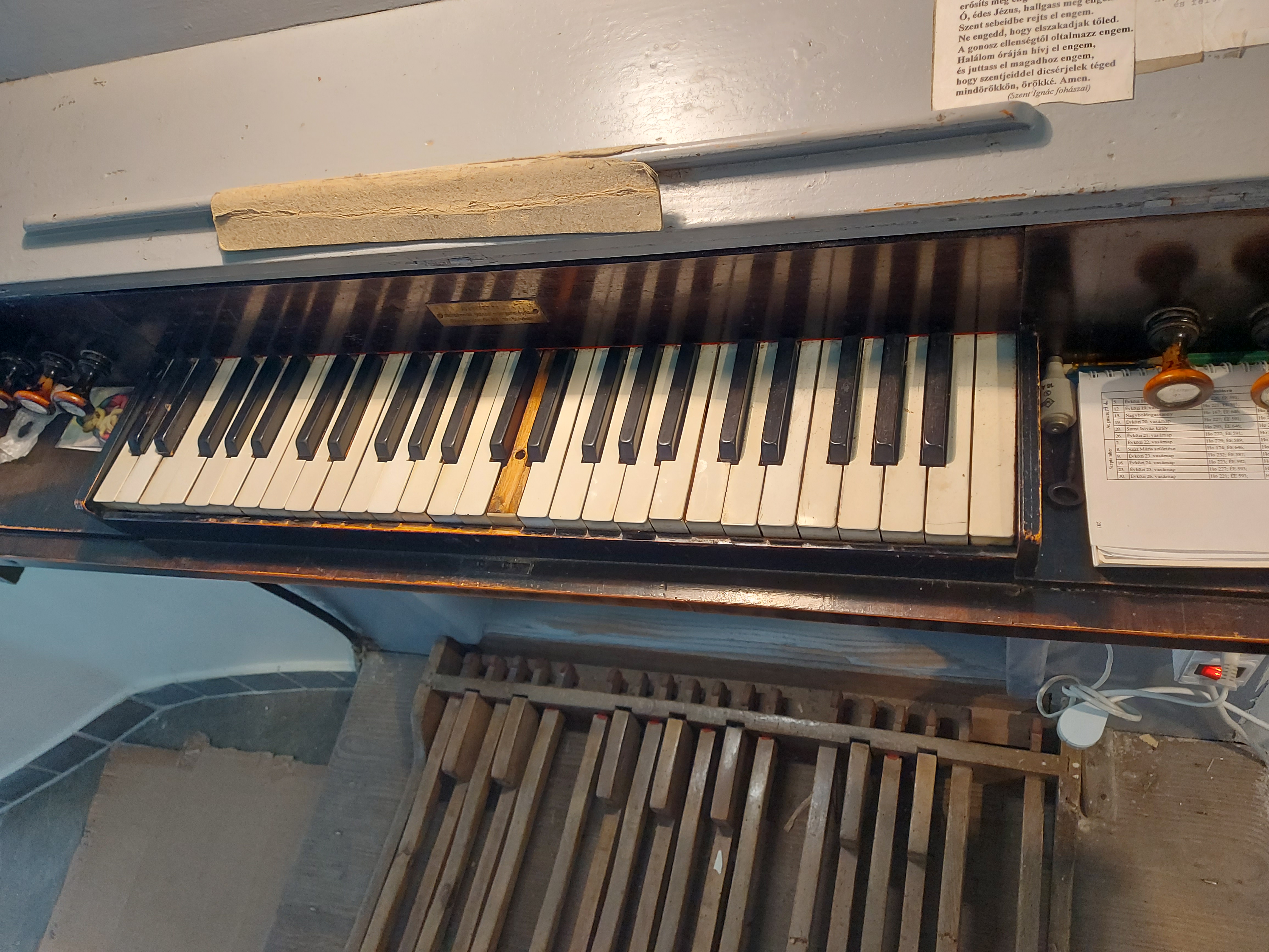 Regiszterek: Subbass 16' (nincs regiszterkapcsolója); Principal 4'; Octave 4'; Bourdon 8'; Flute 4'; Quinte 2⅔'; Super Octave 2'. Mechanikus csúszkaláda-rendszer.