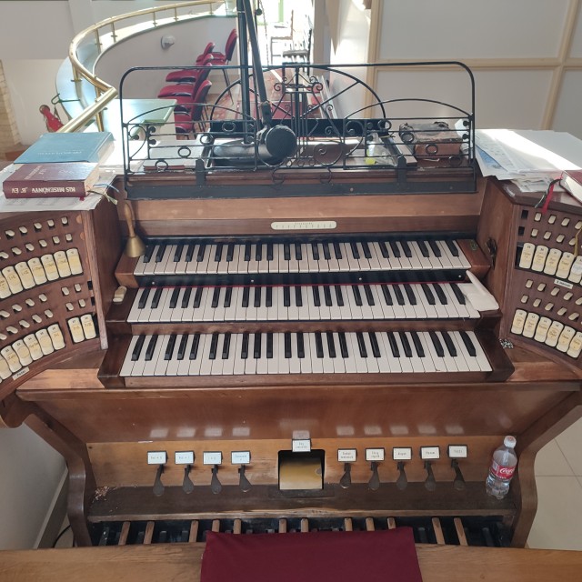 Az orgona 2023-ban kapott egy másik játszóasztalt, mely lent a szentély előtt kapott helyet. Ez egy Domus Prestige 80 típusú elektromos orgona, mely szól magában is. A játékasztal MIDI kimeneteken keresztül egy elektromos vezérléssel lett összekötve a fenti játékasztallal és a hangszer azon keresztül vezérelhető. Az elektromos orgona tulajdonságainak köszönhetően lehetőség nyílt regiszterkombinációk tárolására, regisztercrescendora, valamint pedálgombos programváltásra. Az elektromos orgona regiszterkapcsolóin meg lettek jelölve azok a billentyűk, amelyekre regiszterek lettek kötve a fenti orgonából, illetve a kopula kapcsolók is szintén fel lettek írva az Orchestra kapcsolókra, ahová bekötötték.