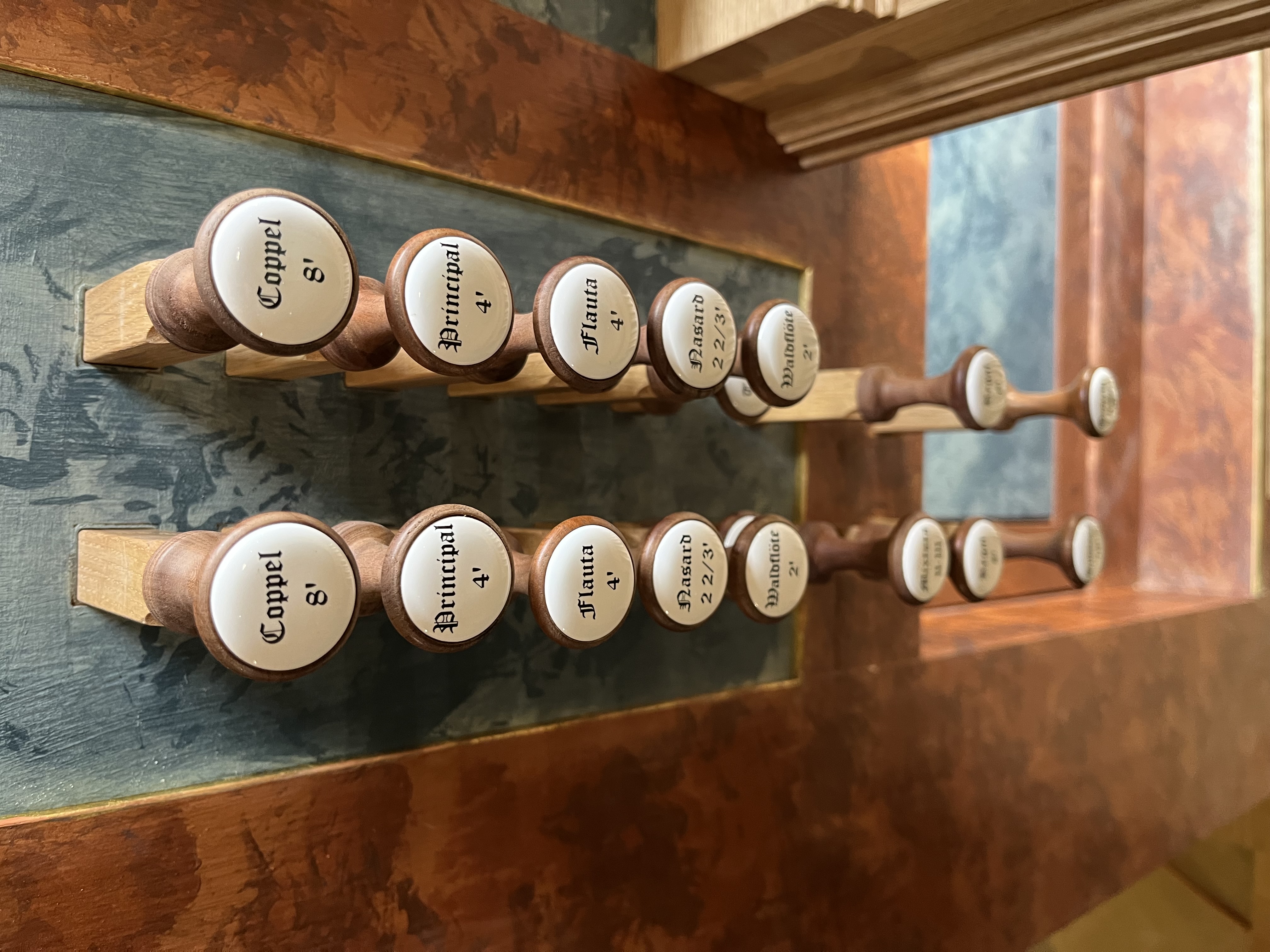Templomtérnek háttal, orgonaszekrénybe építve Osztott manuálklaviatura